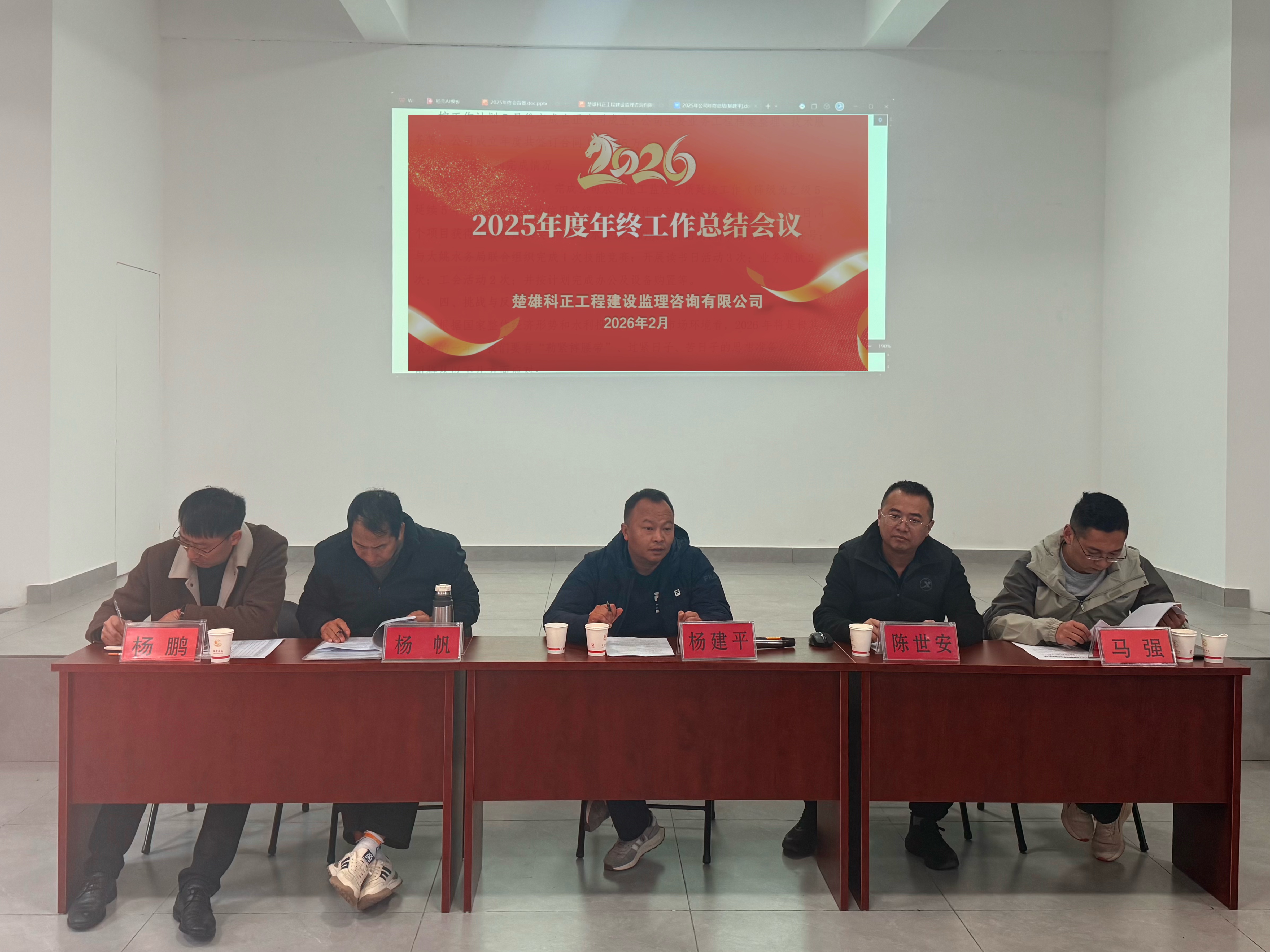 岁序如诗,华章日新。2月8日,楚雄科正工程建设监理咨询有限公司隆重召开2025年度年终工作总结会议。公司领导班子、各部门负责人及全体员工齐聚一堂。公司总经理杨建平出席会议,并作《2025年年终工作总结报告》,副总经理杨帆作《2025年度经营管理工作报告》,会议回顾了2025年的奋斗历程与丰硕成果,擘画2026年发展蓝图,表彰了先进典型。会议由副总经理陈世安主持。