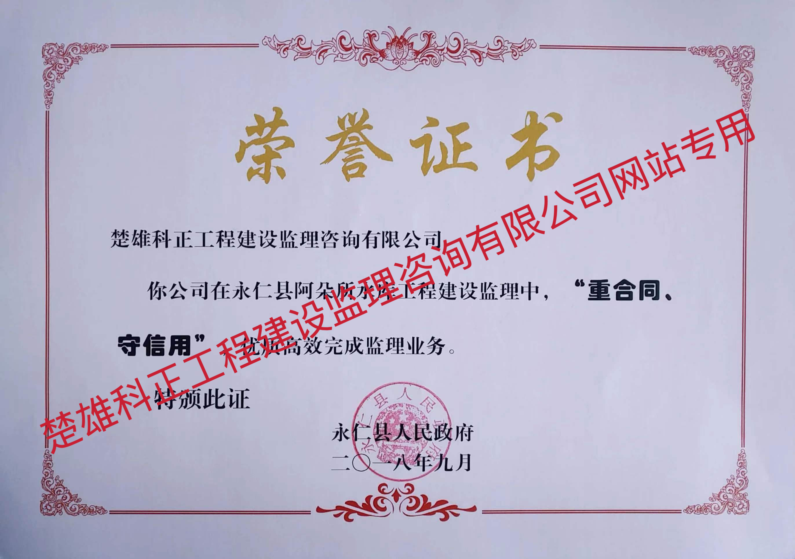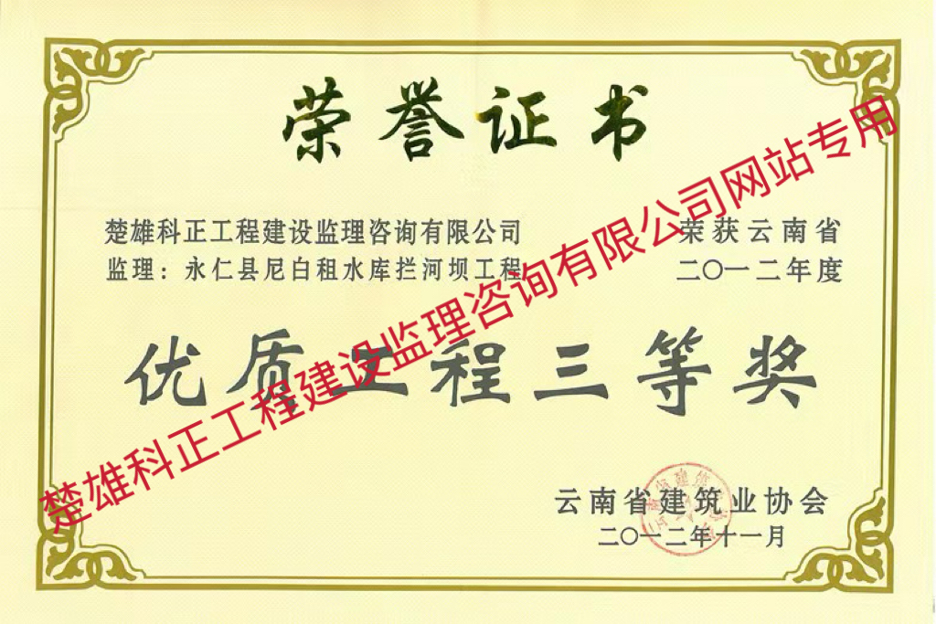 云南省水利工程行业协会会员单位 云南省科技型中小企业 永仁县尼白租水库拦河坝工程获奖证书